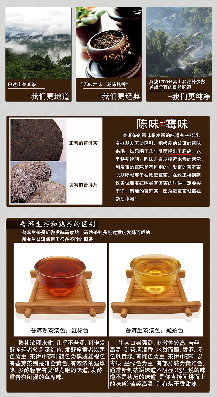 맛:차기족, 차탕은 식감이 탱탱하고 고르게 분포되어 있어 고목차라서 약간 쓴맛이 나고, 생진이 빠르며, 감칠맛이 오래 지속된다.3~5년 더 보관하면 맛이 더 좋아질 것입니다.